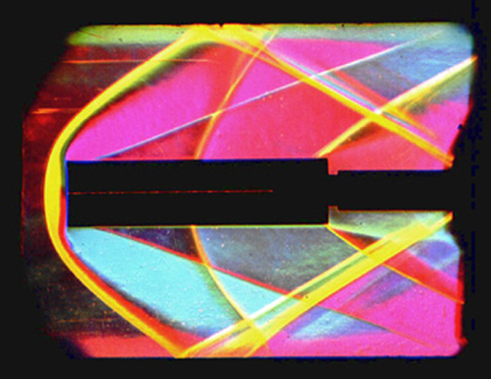 The image shows supersonic airflow at Mach 3 over a blunt-faced cylinder. The picture was taken with a four-color schlieren method.