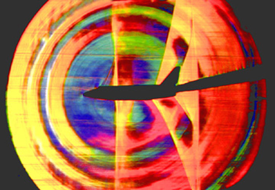 The picture shows a transonic flow over an early test model of the space shuttle in the NASA-Ames 6x6-foot supersonic wind tunnel.