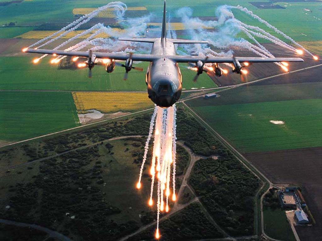 The C-130 Hercules is the most versatile transport aircraft ever made. Over 2,000 have been built over 50 years, making it the longest, continuous production run in history. It's used by over 50 countries, and is one of the most used and safest transport aircraft in operation. Here the plane is ejecting flares during a test of an infrared missile warning and self-protection system installed on a C-130 Hercules. The trailing vortices formed in the wake are clearly visible. See also over clouds and firing sequence.