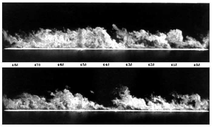 In this image, acetone droplet scattering is used to visualize streamwise cross-sections of a turbulent flat plate boundary