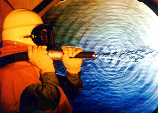 The picture is a schlieren photo of supersonic gas flow and jet noise from an abrasive blasting nozzle.