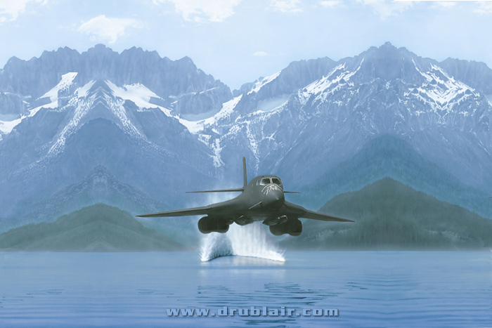 This spectacular painting of a B1 bomber flying over a lake (sea?) appears to show the wake generated by the wave field emanating