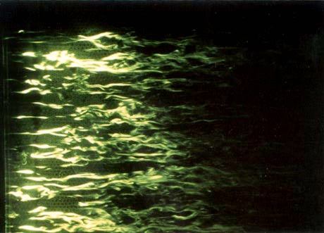 This picture is a top view of the near-wall region of a turbulent boundary layer showing the ubiquitous low-speed streaks. Flow is from left to right and laser-induced fluorescence is used to visualize the streaks.