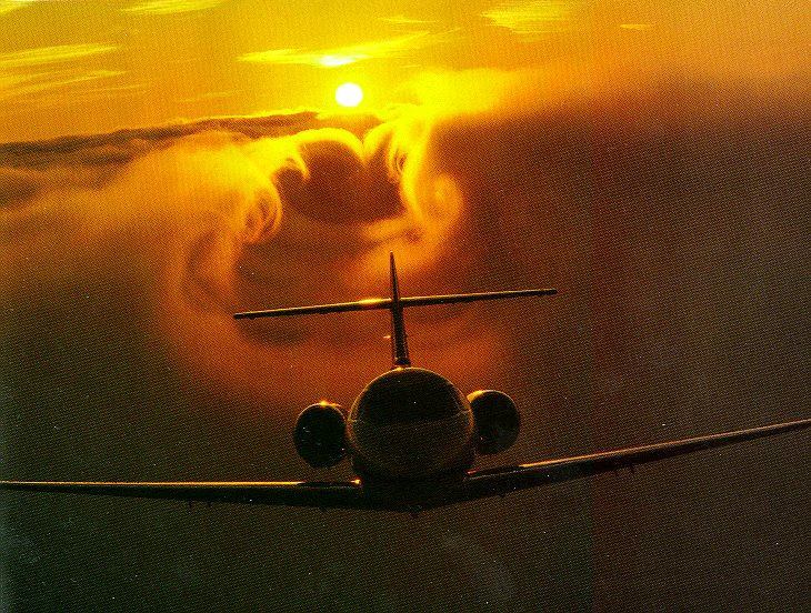 Trailing vortices and downwash phenomenon of an aircraft in flight are seen clearly in this figure. In this situation, a Cessna Citation VI was flown immediately above the fog bank over Lake Tahoe at approximately 313 km/h or 170 knots (B. Budzowski, Director of Flight Operations, Cessna Aircraft Company, private communication, 1993). Aircraft altitude was about 122 m (400 ft) above the lake, and the weight was approximately 8400 kg. As the trailing vortices descended over the fog layer due to the downwash, the flow field in the wake was made visible by the distortion of the fog layer. The aircraft is seen initiating a gentle climb after a level flight, leaving a portion of the fog layer yet unaffected. The wing span measured 16.3 m and the wing area was 29 m^2. The Reynolds number based on the mean aerodynamic chord of 2.1 m was 1.1x10^7. See also Citation 1 and Citation 3.
