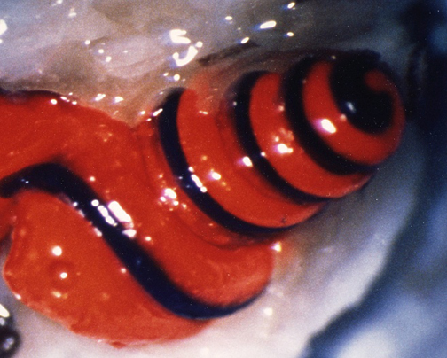 This image shows the two fluid spaces of the cochlea, the perilymph shown orange and the endolymph shown blue. For years it was believed that endolymph and perilymph flowed along the fluid spaces. We developed a method to measure the flow rate in the living ear. The method used an ionic marker which was iontophoresed into the fluids at low concentration. The concentration of the marker was measured simultaneously by two ion-selective microelectrodes at locations "upstream" and "downstream" of the injection site. Analysis involved simulations of the combined effects of flow and diffusion along the spaces.Ê We were able to show that the rate of flow of these fluids is extremely slow, with endolymph flow shown to be less than 1 nanoliter per minute. The method is extremely sensitive and detects very slow flow rates in small compartments.