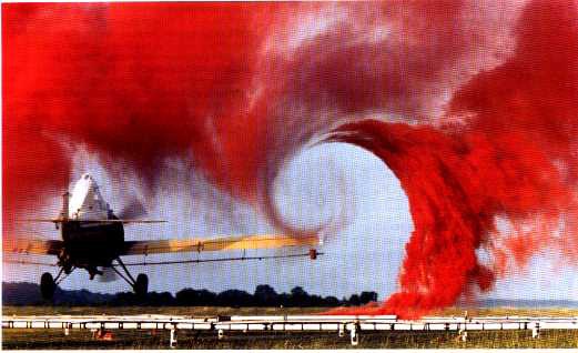 The air flow from the wing of this agricultural plane is made by a technique that uses colored smoke rising from the ground. The swirl at the wingtip traces the aircraft's wake vortex, which exerts a powerful influence on the flow field behind the plane. Because of wake vortex, the Federal Aviation Administration (FAA) requires aircraft to maintain set distances behind each other when they land. A joint NASA-FAA program aimed at boosting airport capacity, however, is aimed at determining conditions under which planes may fly closer together. NASA researchers are studying wake vortex with a variety of tools, from supercomputers to wind tunnels to actual flight tests in research aircraft. Their goal is to fully understand the phenomenon, then use that knowledge to create an automated system that could predict changing wake vortex conditions at airports. Pilots already know, for example, that they have to worry less about wake vortex in rough weather because windy conditions cause them to dissipate more rapidly.