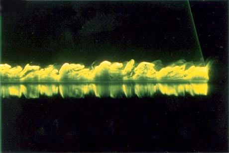 This picture is a side view of the large eddies in a turbulent boundary layer. Laser-induced fluorescence is again used to capture the quasi-periodic coherent structures. Flow is from left to right. Note the reflection from the polished surface.