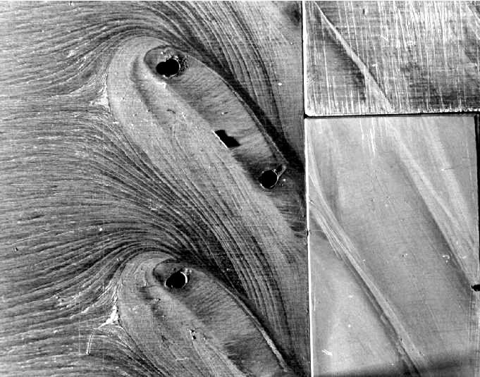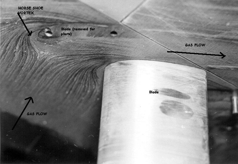 The pictures show the visualization of a horseshoe vortex developing in a cascade of turbine blades. The flow lines at the wall are created by using a layer of oil-titaniumdioxide at the wall of this wind tunnel. The shear forces in the boundary layer create the characteristic streaks that indicate the direction of the flow as well as the state (i.e. laminar, transitional, turbulent or separated) of the boundary layer. In these pictures, a horseshoe vortex forms upstream of the leading edge of the blade, and is subsequently washed to the suction side of the blade below. Downstream Mach number is about 0.95, Reynolds Number is about 600,000. Flow is from left to right.