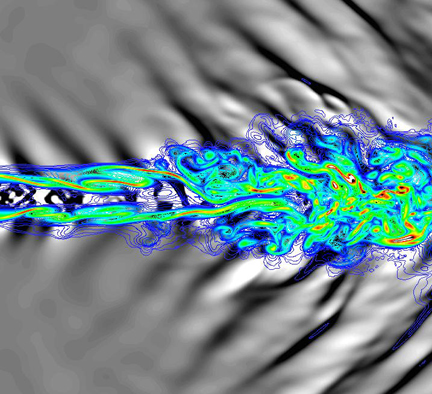 The picture shows a Direct Numerical Simulation of a Mach 1.92 jet. The jet turbulence