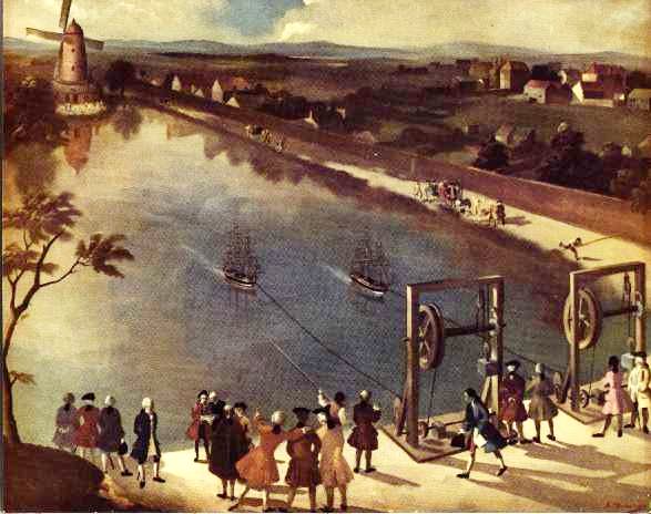 It was not until 1761 that sufficient models had been submitted for the prizes, but that year six entries -- four 32-gun frigates and two 74-gun ships -- were tried out at Peerless Pool, near Old Street, in the City of London, as shown in the scene reproduced here, which was especially painted for the Society by Miss Anna Zinkeisen, R.O.I., R.D.I.