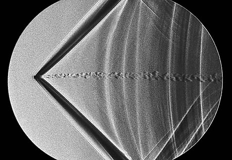 The photograph was obtained using a schlieren system and shows a .22 caliber bullet flying at about