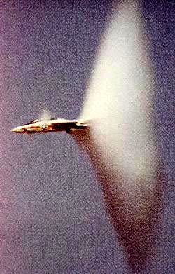 The picture shows condensation produced by a shockwave in transonic flight.