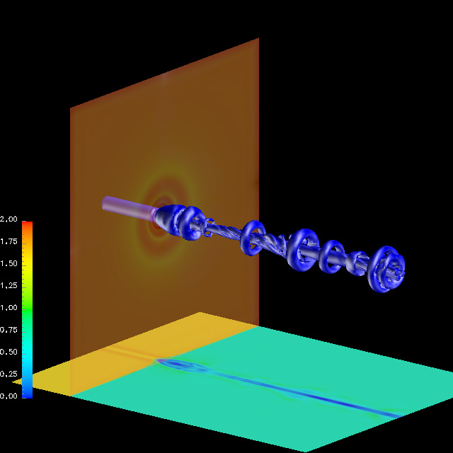 The picture shows vortex breakdown, enforced by the interaction of a normal shock and a slender vortex with its axis parallel to the oncoming supersonic flow. The phenomena was numerically simulated with a finite-volume solution of the Navier-Stokes equations for time-dependent, compressible, viscous flow. The conservation equations were written in divergence form, with the time derivatives discretized with a Runge-Kutta five-step scheme, and the spatial derivatives with a node-centered finite-volume technique. A cartesian grid was used with clustering of grid points near the axis of the vortex. The total number of grid points was 2 millions. Computations were carried out for a free-stream Mach number Ma=1.6 and a Reynolds number Re=15000, based on the initial vortex core radius. The inflow profile of the azimuthal velocity component was prescribed by a BurgersŤ vortex with the circulation Gamma=2.5, non-dimensionalized with the vortex core radius and the stagnation speed of sound. The inflow profile for the axial velocity component was assumed to be Gaussian with a velocity defect of 10 percent. The temperature distribution was computed from isentropic relations. The figure shows the flow downstream from the normal shock, visualized by the plane normal to the vortex. The breakdown process is characterized by vortex shedding immediately downstream from the shock and subsequent spiraling of the inner part of the core. The iso-surfaces shown represent surfaces of constant pressure.
