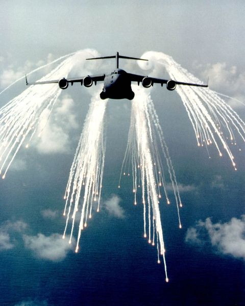 This is a photo of the C-17 Globemaster III ejecting flares. Flares are used as a countermeasure to protect against "heatseeking" or infrared missiles. The wake vortices are clearly visible behind the aircraft. It is an official USAF photo.