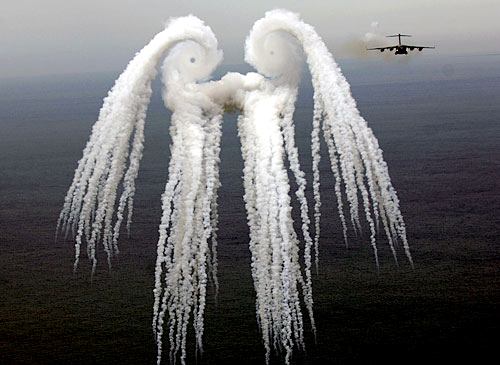 A C-17 Globemaster III from the 14th Airlift Squadron, Charleston Air Force Base, S.C., leaves a smoke trail after releasing flares over the Atlantic Ocean during a local exercise above the Charleston area, May 16, 2006. The vortex from the Globemaster engine created the image of a "smoke angel" in the sky. U.S. Air Force photo by Tech. Sgt. Russell E. Cooley IV. It is an official USAF photo.