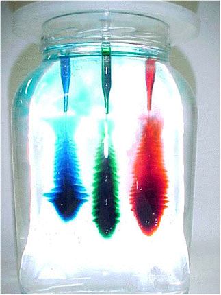 Three holes were punched in the plastic lid from a coffee can. Glass eyedroppers, filled with a different color of food coloring, were carefully inserted into the holes. The dense food coloring "falls through" the less dense frehs water but does not penetrate the denser saltwater layer. After approximately 30 minutes, the food coloring forms the tree-like patterns shown in the photograph.