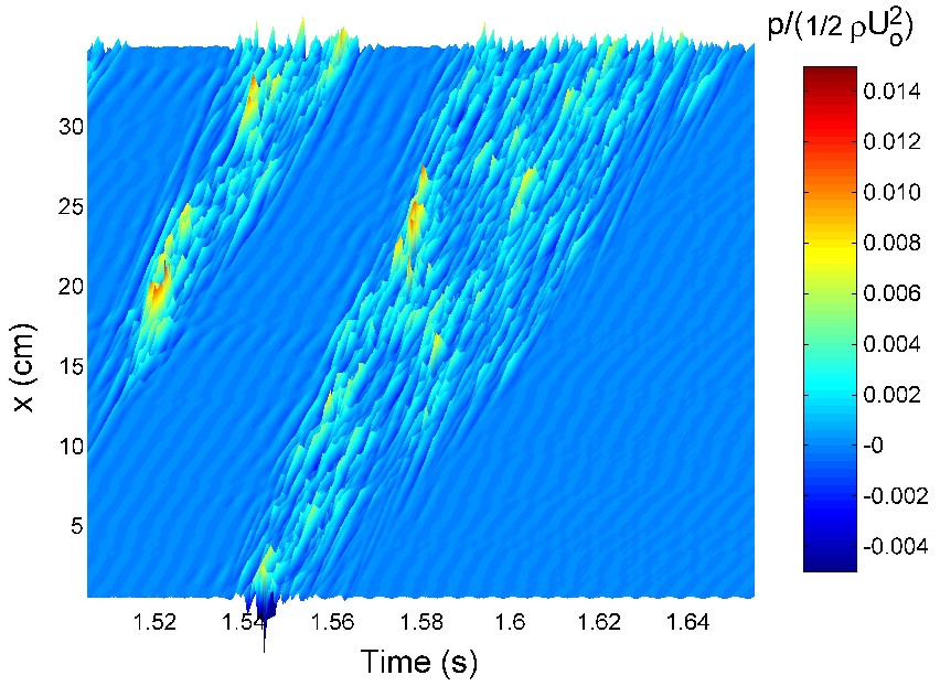 64-element linear array of microphones illustrating spatio-temporal formation, convection and growth of turbulent spots. For