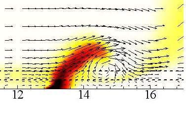 The picture shows the temperature and velocity field during the propagation of a wildfire. It was obtained from numerical simulation using a multiphase formulation. This calculation was performed for a surface fire propagating through a Mediterranean shrub with a wind velocity equal to 2m/s. The flow near the fire front is characterized by the formation of a column of hot gases at the top of the burning zone (the plume) which deviates the wind flow and aspires fresh air at its base.
