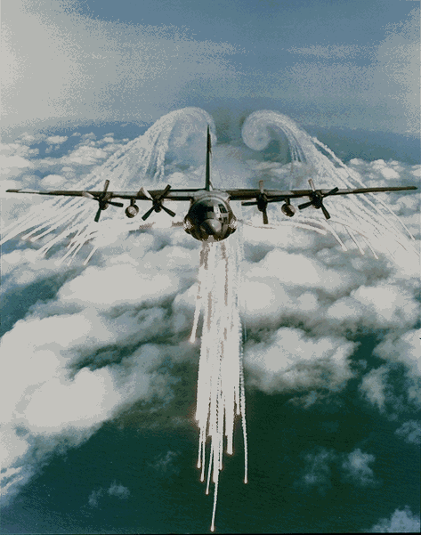 A picture from the 1993 Aviation Week & Space Technology Photo Contest. This came second in the Military category. The plane is ejecting flares during a test of an infrared missile warning and self-protection system installed on a C-130 Hercules. The trailing vortices formed in the wake are clearly visible. The size of these vortices is related to the lift produced by the wings, and the photograph suggests that the aircraft was climbing during this maneuver. See also firing sequence and over ground.